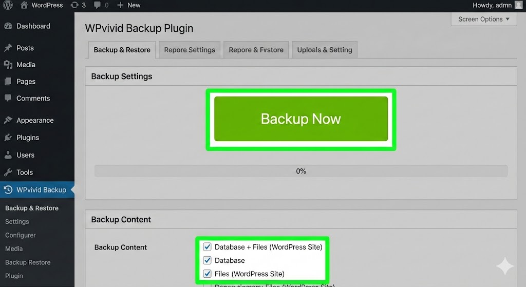 Entra a tu WordPress > Plugins > Añadir nuevo. Busca "WPvivid Backup" e instálalo/Actívalo. Ve a WPvivid > Backup. Haz clic en "Backup Now" para crear una copia completa (archivos + base de datos). Descarga el archivo .wpress a tu computadora.
