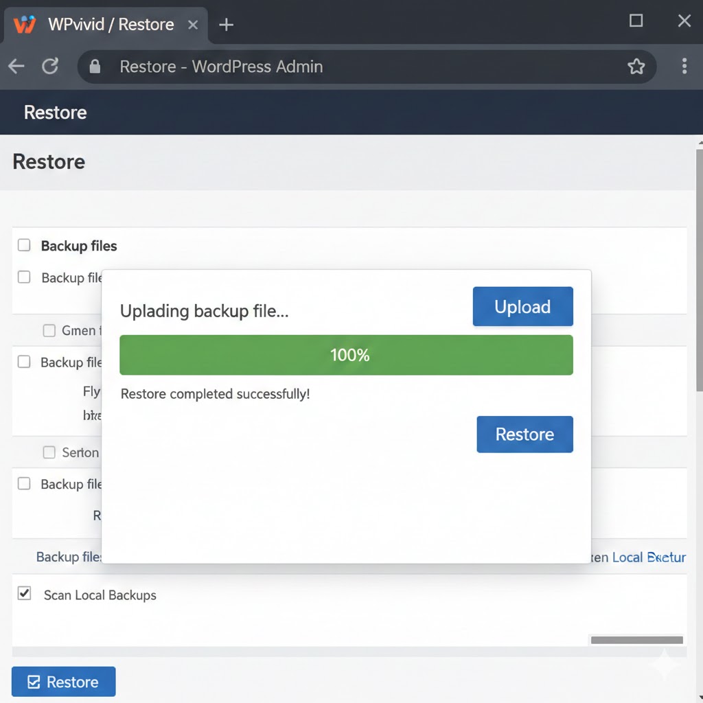 En el nuevo WordPress, instala y activa WPvivid. Ve a WPvivid > Restore. Sube el archivo .wpress descargado y haz clic en "Restore". Espera unos minutos; el plugin actualizará URLs automáticamente al nuevo dominio. Borra la caché si usas plugins como WP Rocket.